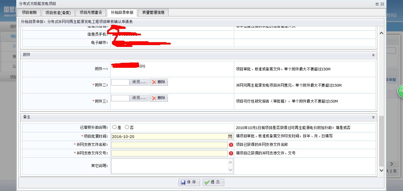 项目并网验收后,拿到电网公司的并网意见单,才可以填报补贴目录申请,如下图: